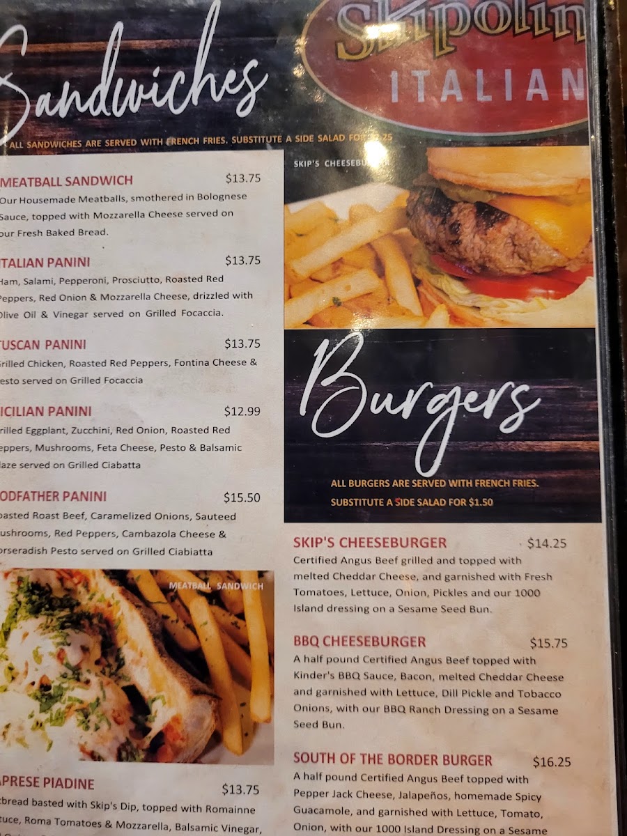 At Skipolini's, the menu features a variety of pizzas, allowing you to customize your experience with Half & Half Pizzas, where you can create a single pizza divided into two flavors. Choose from different sizes ranging from 10 to 16 inches with options for both Build Your Own and Specialty Pizzas priced from $22.71 to $44.28. Each pizza is a canvas of fresh ingredients, crafted to offer a delightful medley of flavors that will tantalize your taste buds. Imagine biting into a perfectly baked crust, with toppings that melt together beautifully – it's a pizza lover's dream come true!